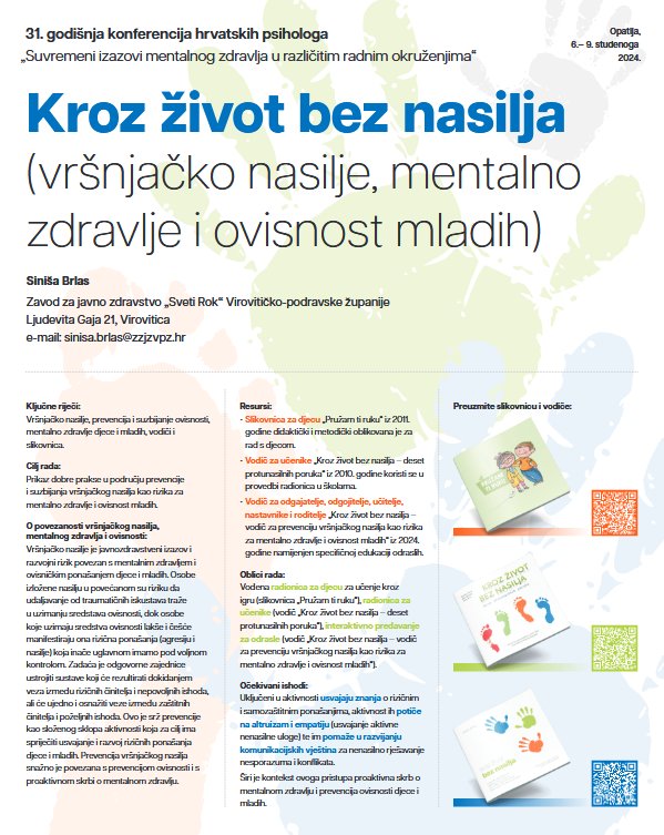 Ovaj poster je prikaz dobre prakse u području prevencije i suzbijanja vršnjačkog nasilja kao rizika za mentalno zdravlje i ovisnost djece i mladih. Njime su predstavljeni slikovnica, vodič za djecu i mlade te vodič za učitelje, nastavnike, stručne suradnike, odgojitelje i odgajatelje. Alati su to u pristupu koji se pod nazivom „Kroz život bez nasilja“ kontinuirano od 2010. godine provodi u Virovitičko-podravskoj županiji, ali sve češće interes za ovaj model rada s djecom i mladima dolazi i izvan županijskih, pa i izvan državnih granica. Očekivani ishodi aktivnosti koje se provode su usvojiti znanja, potaknuti altruizam i empatiju, razvijati komunikacijske vještine te osnažiti emocionalnu otpornost djece i mladih u izazovnim i stresnim situacijama. Širi je kontekst skrb o mentalnom zdravlju i prevencija ovisnosti djece i mladih.